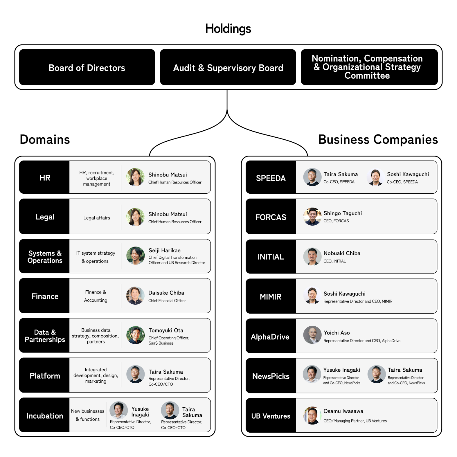 In its Board of Directors meeting held today, Uzabase, Inc. has resolved to appoint new directors as well as to abolish its Group Executive Officer system, transitioning to a new structure wherein Group-wide execution will be carried out by a management team comprising executive officers in charge of seven highly specialized domains across the Group and executive officers for individual business units.
