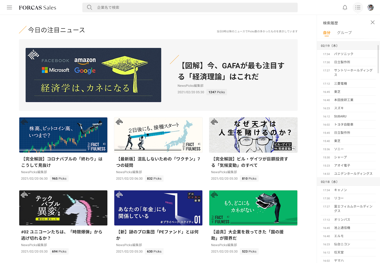 FORCAS SalesとNewsPicksが連携することで、NewsPicksのオリジナル記事を営業活動にシームレスに活かすことができます。さらに、営業先の企業について、世間一般の注目を集めているニュースをPicks数が多いニュースとして、すぐに知ることもできます。