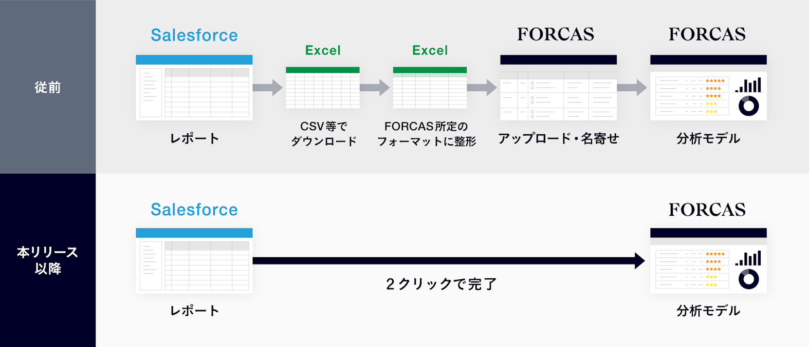 今回の連携により、既存顧客・商談・リードなどの情報を、2クリックでSalesforceからFORCASの顧客分析ダッシュボードにデータ送信することが可能となります。
