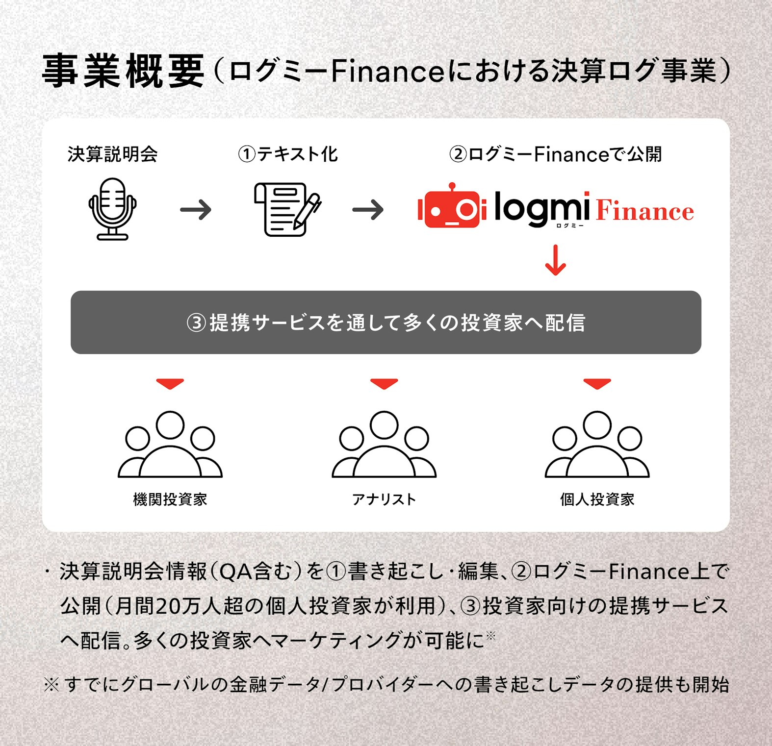 ログミーは、イベントやインタビューの書き起こしメディアを祖業とし、そこで培ったノウハウを活かしてIR支援領域の「ログミーFinance」へと事業を拡大させてきました。今回、当社グループに参画する「ログミーFinance」は、決算説明会やIRイベントの内容を、質疑応答を含めて迅速に全文書き起こし公開する国内最大級のメディアであり、月間20万人を超える投資家が利用する、資本市場における「情報の民主化」を支えるインフラとなっています。