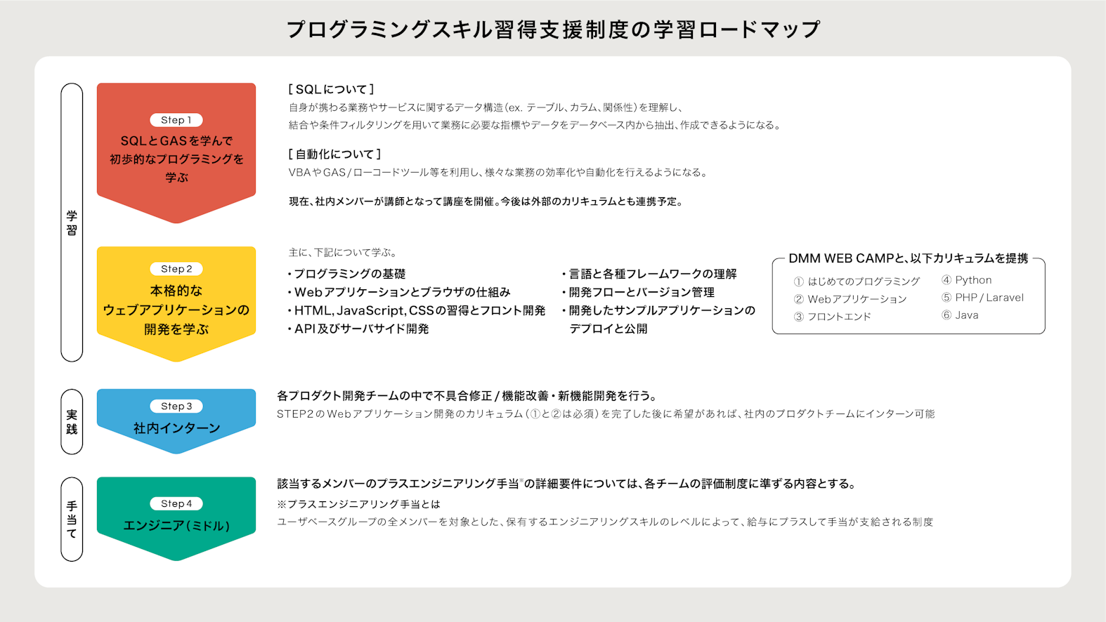 さらに本制度の導入においては、意志を持ってエンジニアリングを学習していくメンバーの挑戦をサポートしていくために、DMM WEBCAMP(株式会社インフラトップ)とパートナー提携を結び、全社のエンジニアリング力の底上げに取り組みます。