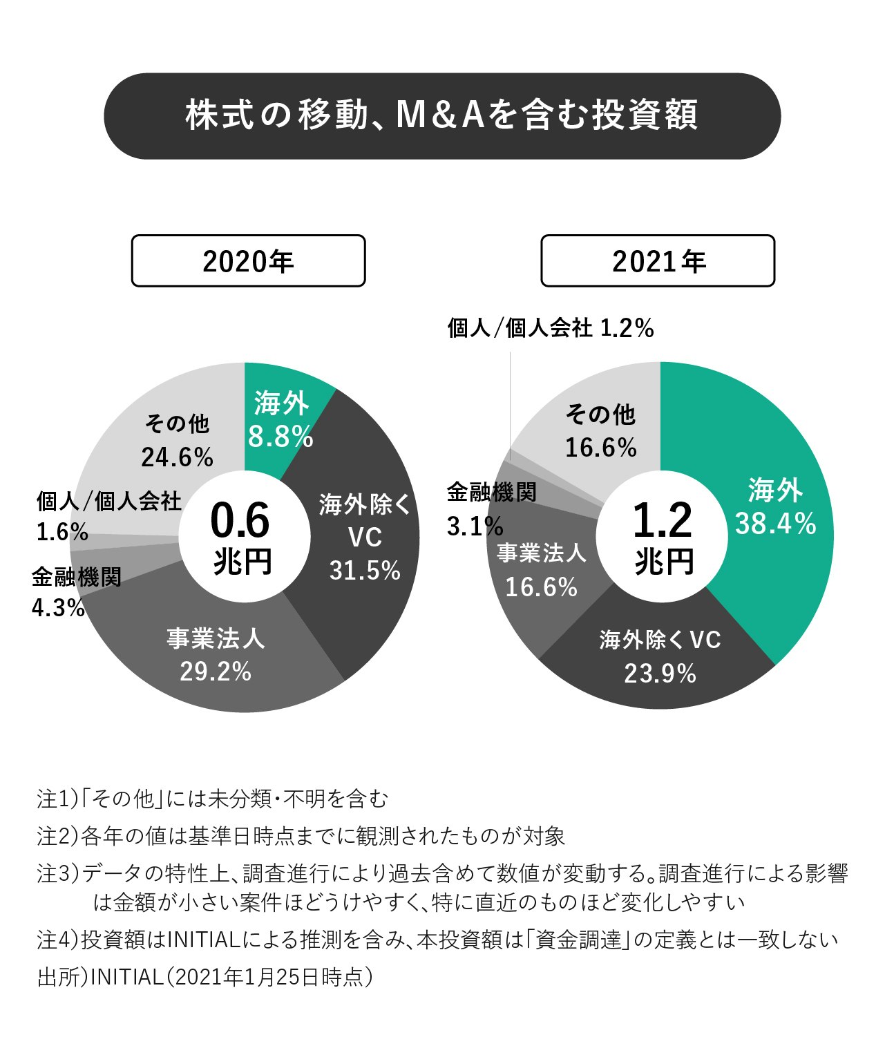 スタートアップ企業に記録的な規模で投資マネーが流入。株式の移動とM&Aを含む投資額でみると1.2兆円あり、特に海外からの投資が後押しする形で(グラフ②)、従来では見られなかった規模の大型資金調達を成功させるスタートアップが次々と登場した。