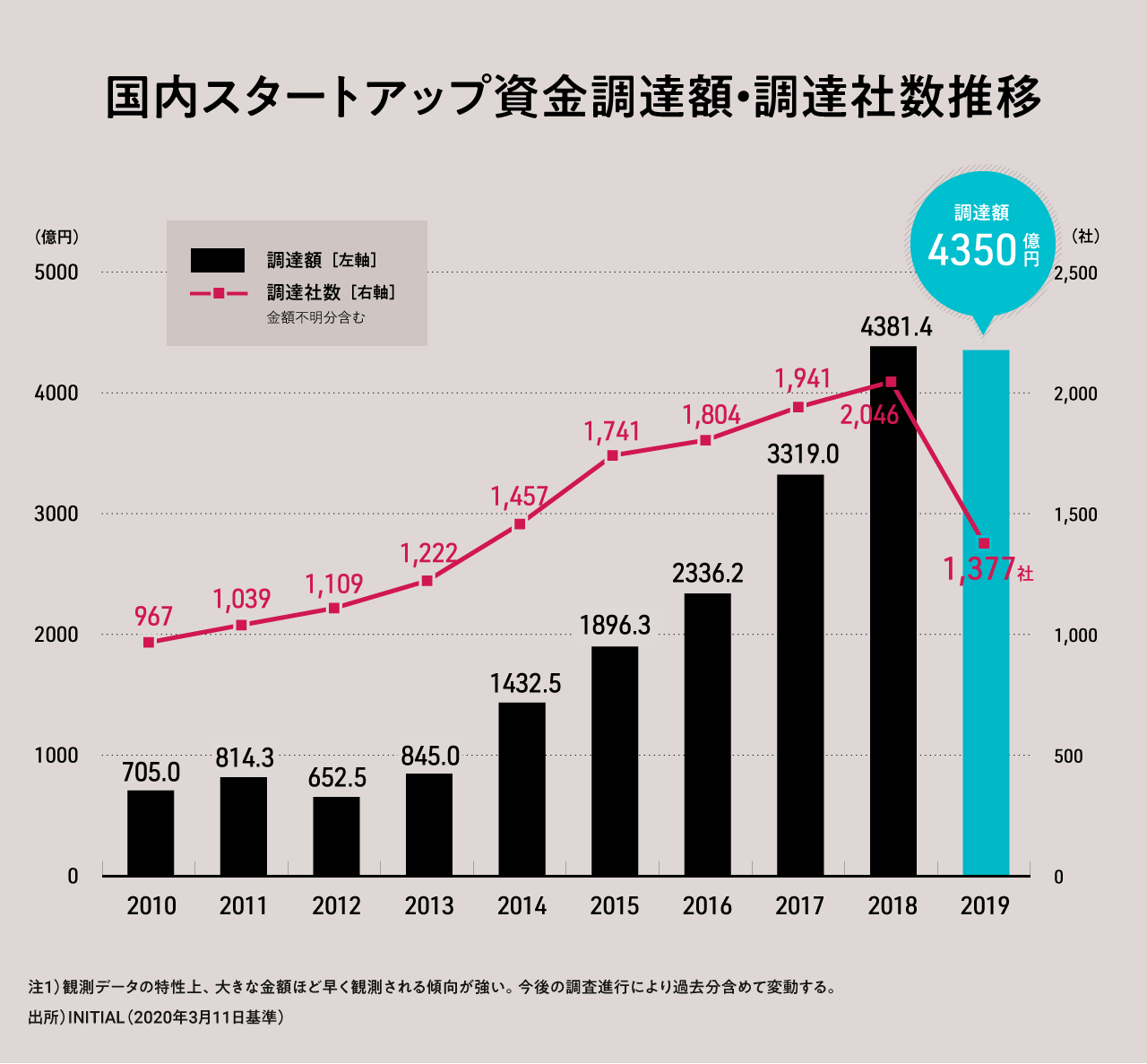 今回、2019年の資金調達額が4350億円のため、2018年の調達額を上回ると考えられるが、伸び幅に関しては例年に比べやや落ち着いたといえる。