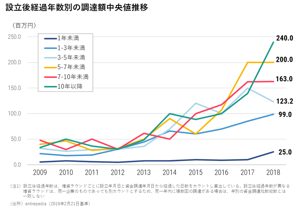 また、2018年の特徴として、設立1年未満のスタートアップ企業が10億円超の調達をしており、中央値もあがっている。