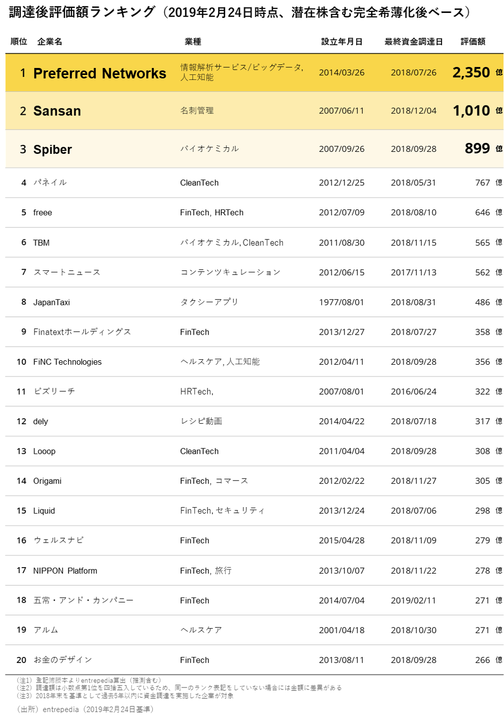 設立後10年以上の企業、SansanやSpiberなどのレイター企業も大型調達を成功させている。Sansanは調達後評価額が1,000億円(潜在株含む完全希薄化後ベース、登記簿謄本よりentrepedia算出(推測含む))を突破し、Preferred Networksにつづくユニコーンとなった。