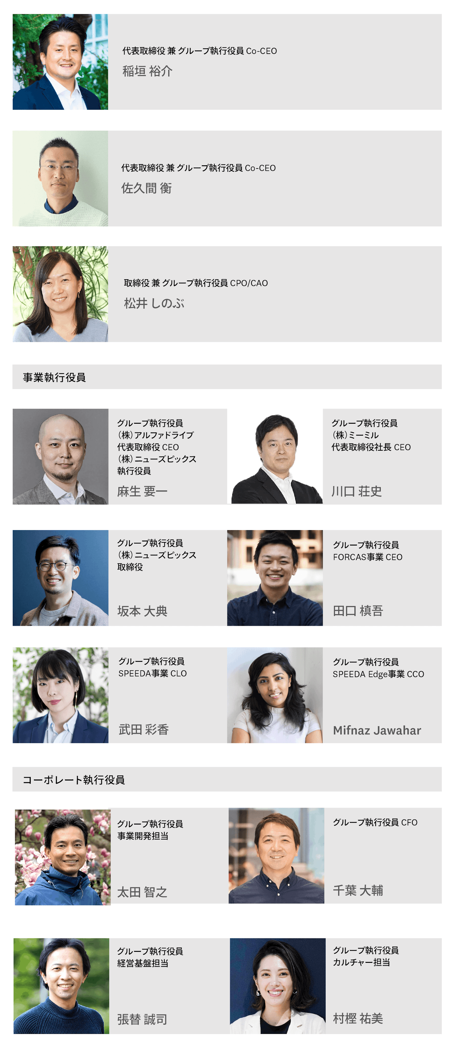 グループ全体、事業部別の執行役員を含めた総勢43名の執行役員の中から、その時々のグループの重要経営課題に合わせてグループ執行役員を毎年選任(任期1年)します。多様なバックグラウンドをもつ経営人材が、ユーザベースグループ全体の視点を持って経営課題に取り組み、パーパスの実現とユーザベースグループ全体の経営目標の達成にコミットします。