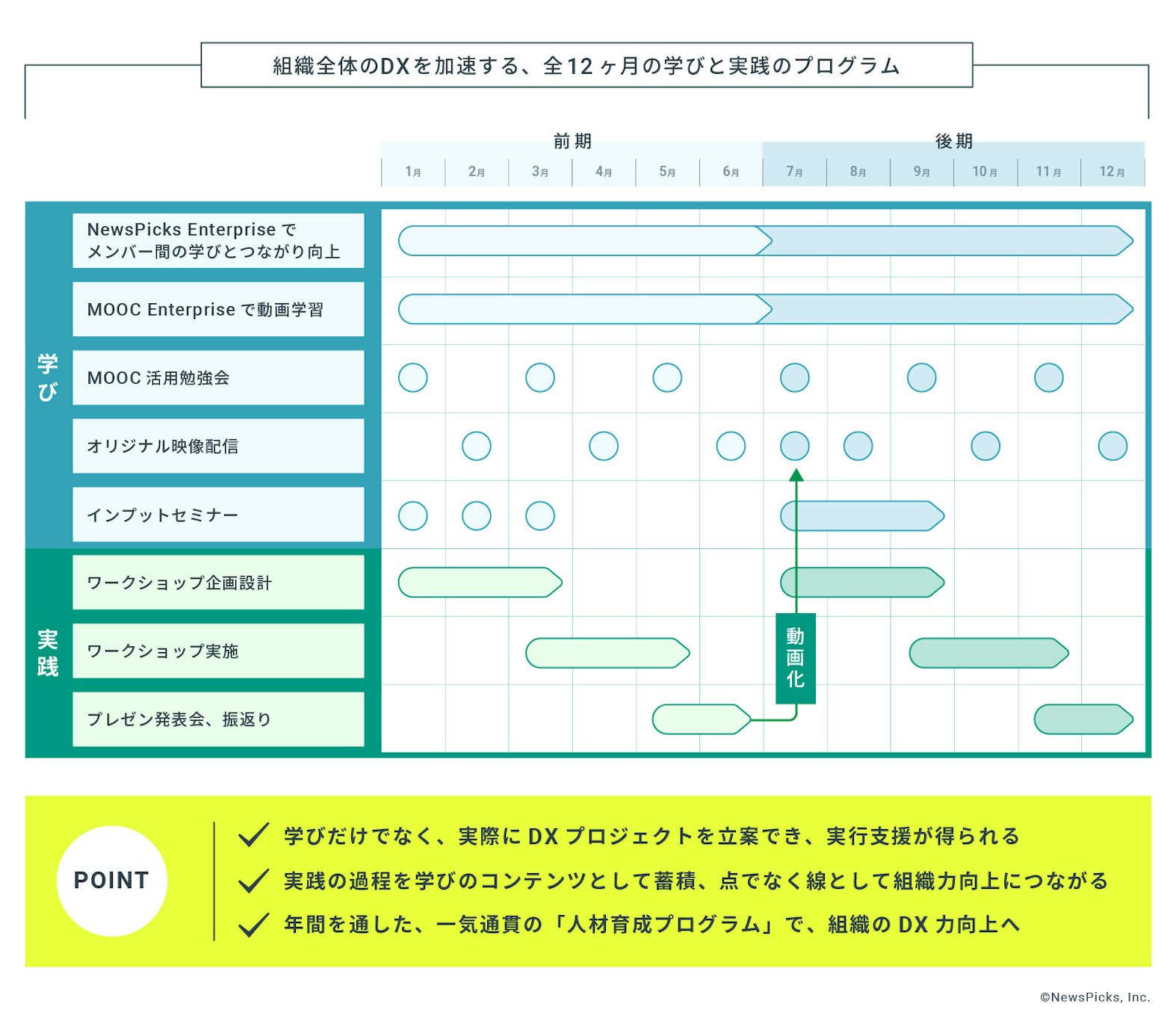 NewsPicksが支援する自律型の学習と、本プログラムが支援する実践型のDX学習を組み合わせ、企業内でDXを牽引できる次世代リーダー人材育成の実現を目指していきます。