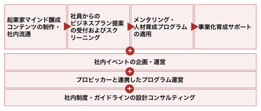アイディアを思いついただけの「ただのサラリーマン」の状態から、経営陣もしくは全社員の前で堂々とプレゼンテーションを行い、投資判断を得られる状態まで、提案力と社内起業家力を高める人材育成プログラムを、提案した社員ひとりひとりに沿った形で適用します。