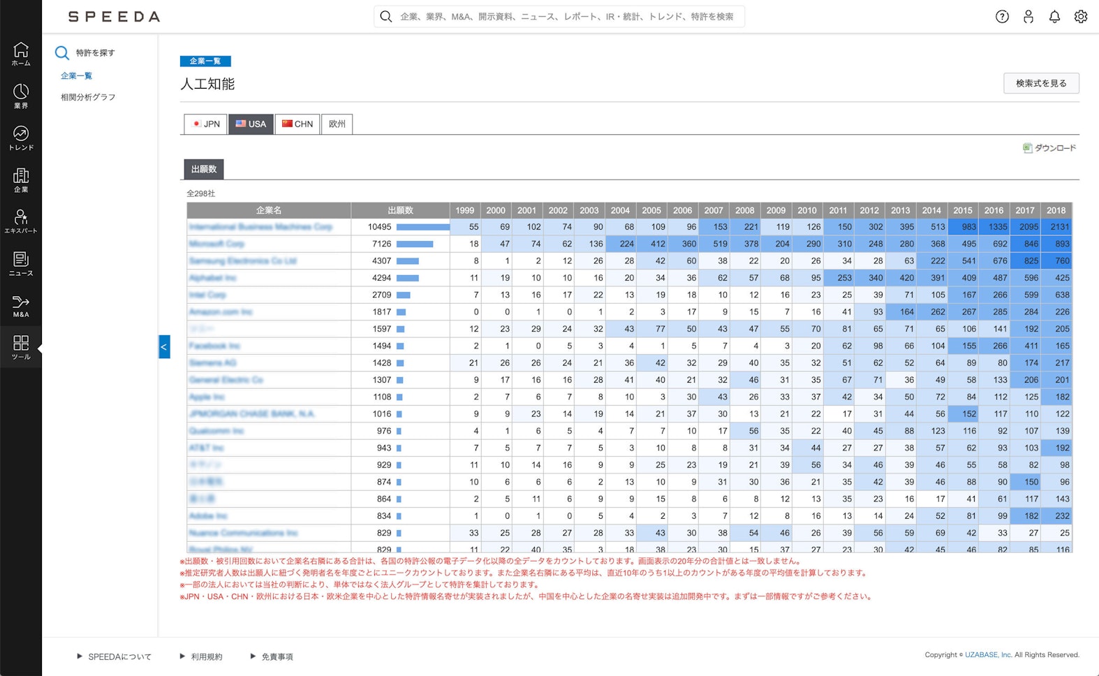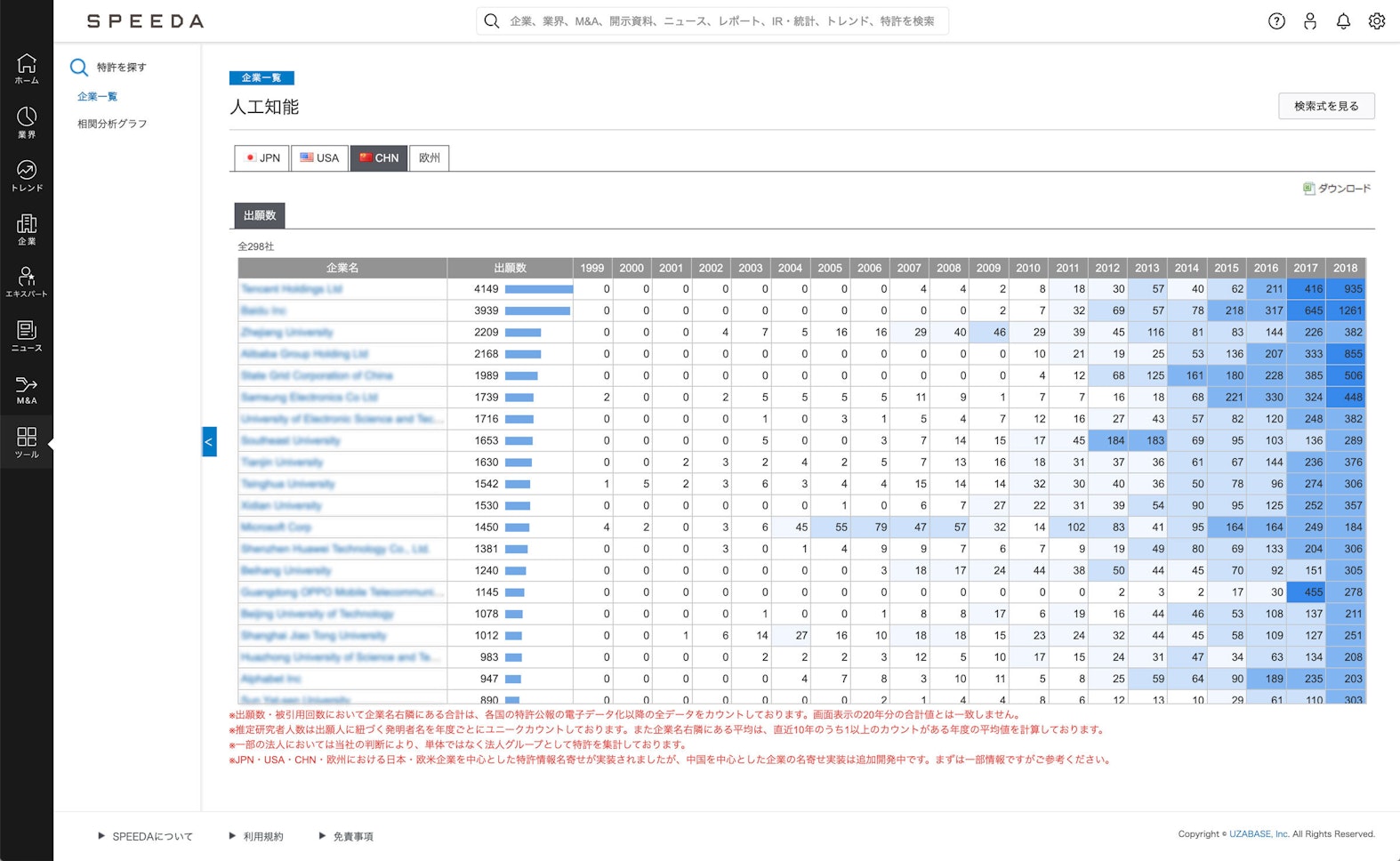 株式会社ユーザベースは、経済情報プラットフォーム「SPEEDA」が提供する「特許動向検索」機能に、米中欧のグローバルデータを追加実装いたしましたのでお知らせいたします。