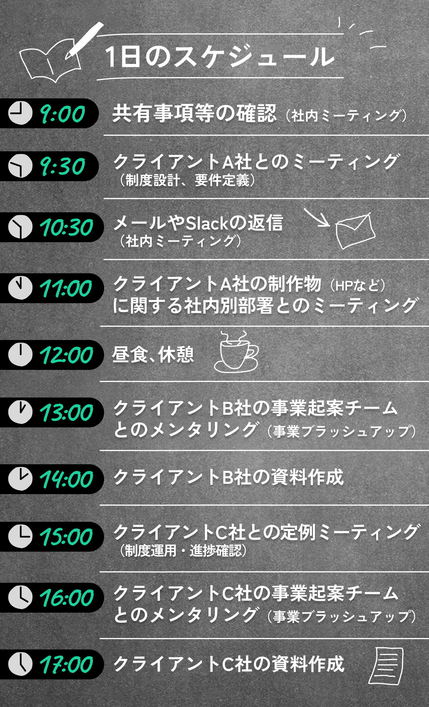 1日の大半はお客様とのミーティングです。要件定義中だったり、既にプログラムが走っていたりと、さまざまなフェーズのお客様と打ち合わせをしています。