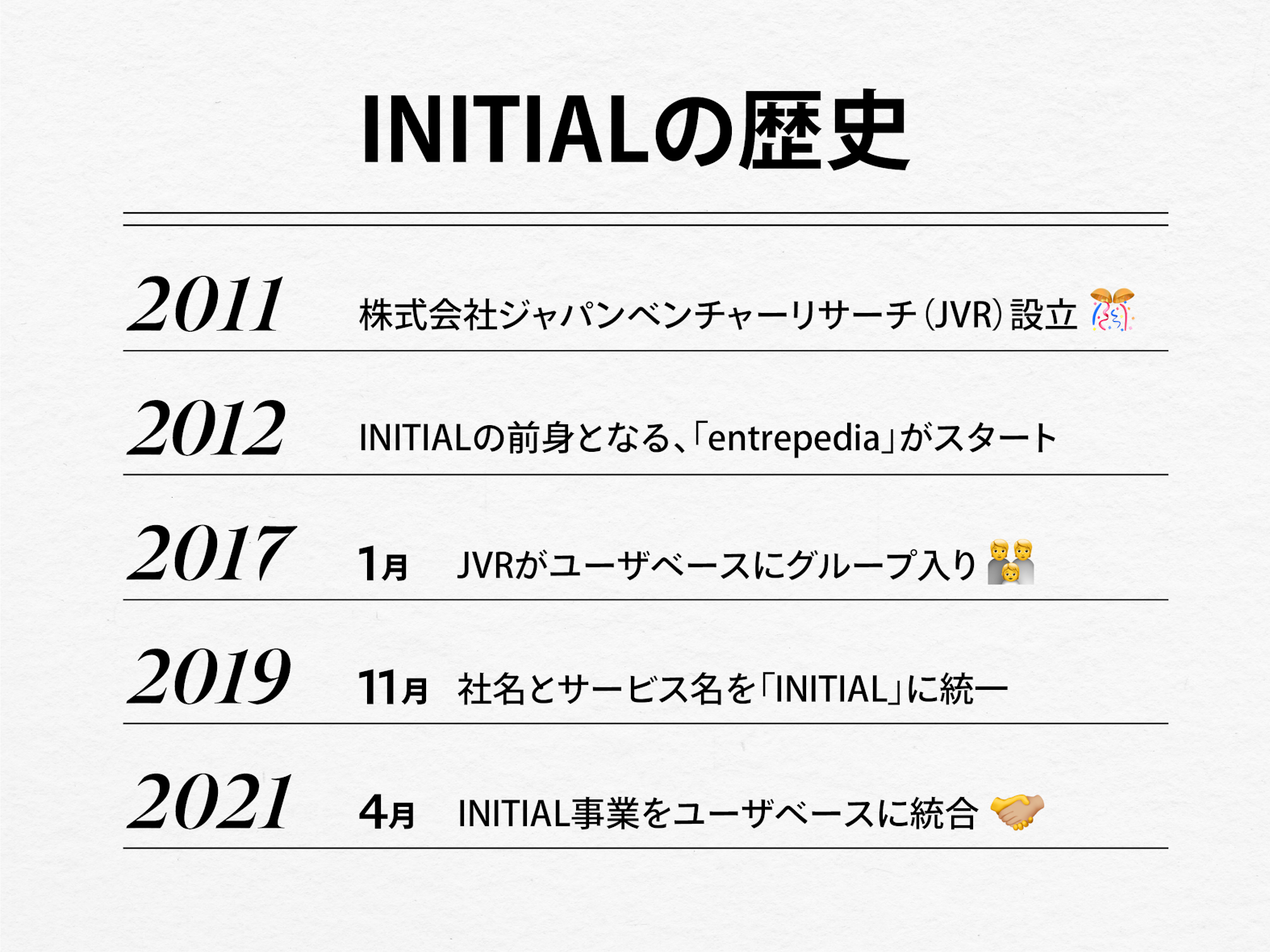 実はINITIALは、ユーザベースから生まれたプロダクトではありません。もともとは株式会社ジャパンベンチャーリサーチ(以下「JVR」)という会社で誕生しました。2017年にユーザベースがJVRをM&Aにより買収し、事業統合した背景があります。