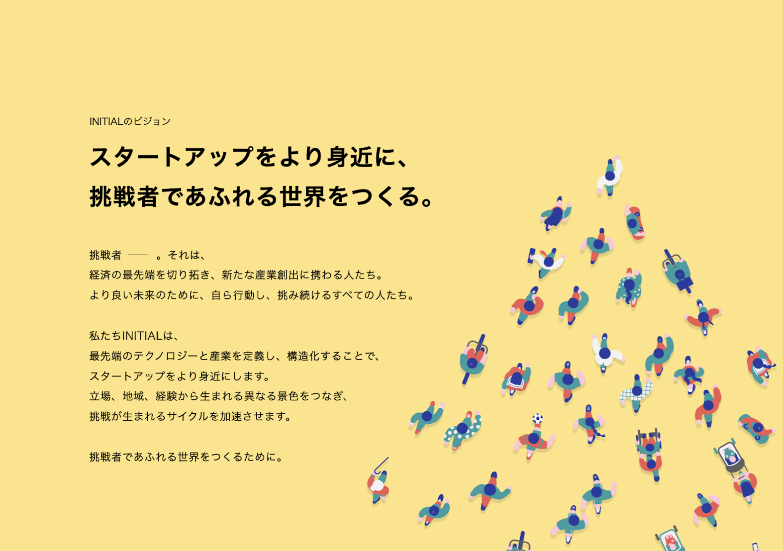 INITIALのビジョンは、「スタートアップをより身近に、挑戦者であふれる世界をつくる」です。