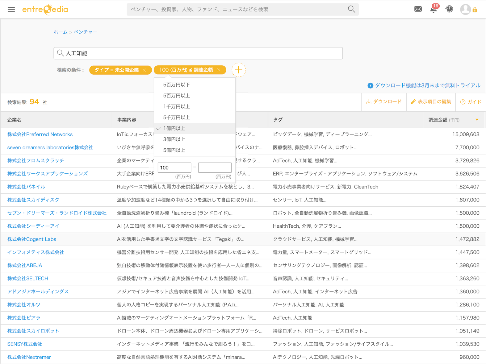 さらに、検索結果のベンチャー企業リストをダウンロード(※2)できるようになりました。ダウンロード機能はオプション化を予定しておりますが、有料ユーザーであれば、3月末まではトライアル期間として無料でダウンロードが可能です。