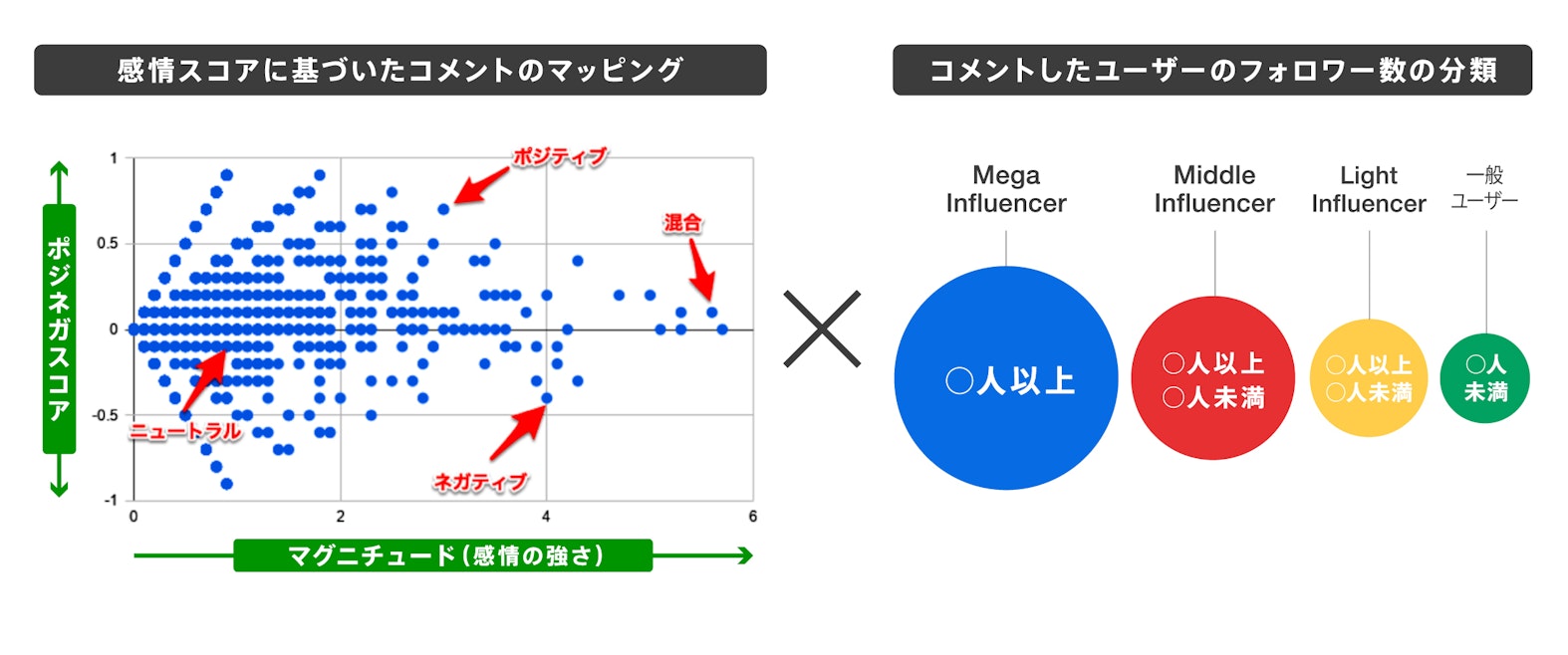記事についたコメントを Google Cloud の Cloud Natural Language API に掛けたうえで、各コメントの「感情」をひとつずつポジティブ・ネガティブ(縦軸)およびマグニチュード(感情の強さ/横軸)の指数でスコアリングします。そこに、コメントを発したユーザーの「拡散力(フォロワー数)」を掛け合わせて分析。導き出された指数をマッピングすることで、記事についたコメント全体の傾向を捉えることを可能にします。