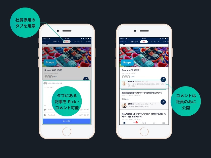 今回、丸紅において社内コミュニケーションの更なる充実化を図ると共に、外部のトレンド情報を効率的に収集するため、本サービスが導入されました。社員だけが閲覧できる法人専用タブが新設され、スマホに最適化された自社コンテンツや、社内向けに配信されたニュースクリッピングの閲覧が可能となります。プッシュ通知機能も備わっているため、最新コンテンツの更新をタイムリーに発信することができます。また、気になるニュースには社員がコメントを投稿する機能も備えており、部署を超えた知見の共有が可能となるため、社内コミュニケーションの活性化にもつながります。