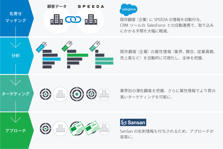 本機能はSalesforce、クラウド名刺管理サービスSansanとの自動連携も実現します。Salesforceで管理されている顧客情報、Sansanで共有管理されている名刺情報(コンタクト先)をAPIを通じて自動で取り込み、SPEEDA内の企業情報とひも付け、営業候補先の自動抽出に活用します。