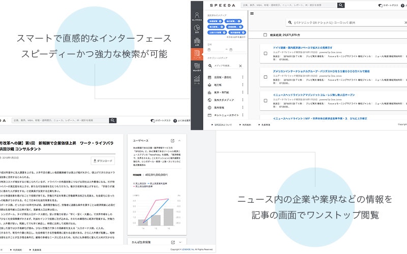 SPEEDAは、ビジネスパーソンの情報収集・分析における課題を解決する最先端のプラットフォームです。世界中の企業情報、業界レポート、市場データ、ニュース、統計、M&Aなどあらゆるビジネス情報をカバーしています。現在、事業会社、金融機関、コンサルティングファームなど600社を超える 導入実績があります。中期経営計画策定、M&A戦略策定、海外戦略策定、新規事業開発、競合企業調査、営業戦略策定、営業企画策定、マーケティングなど様々なビジネスシーンで活用されています。