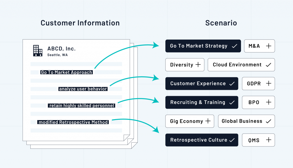 FORCAS Scenario-Based-Analytics Platform provides actionable analytics by co-creating “scenarios” with users. Scenarios are digital flags that help identify the reasons why each customer purchased a product. In other words, scenarios serve to convert “needs” to “accounts”.