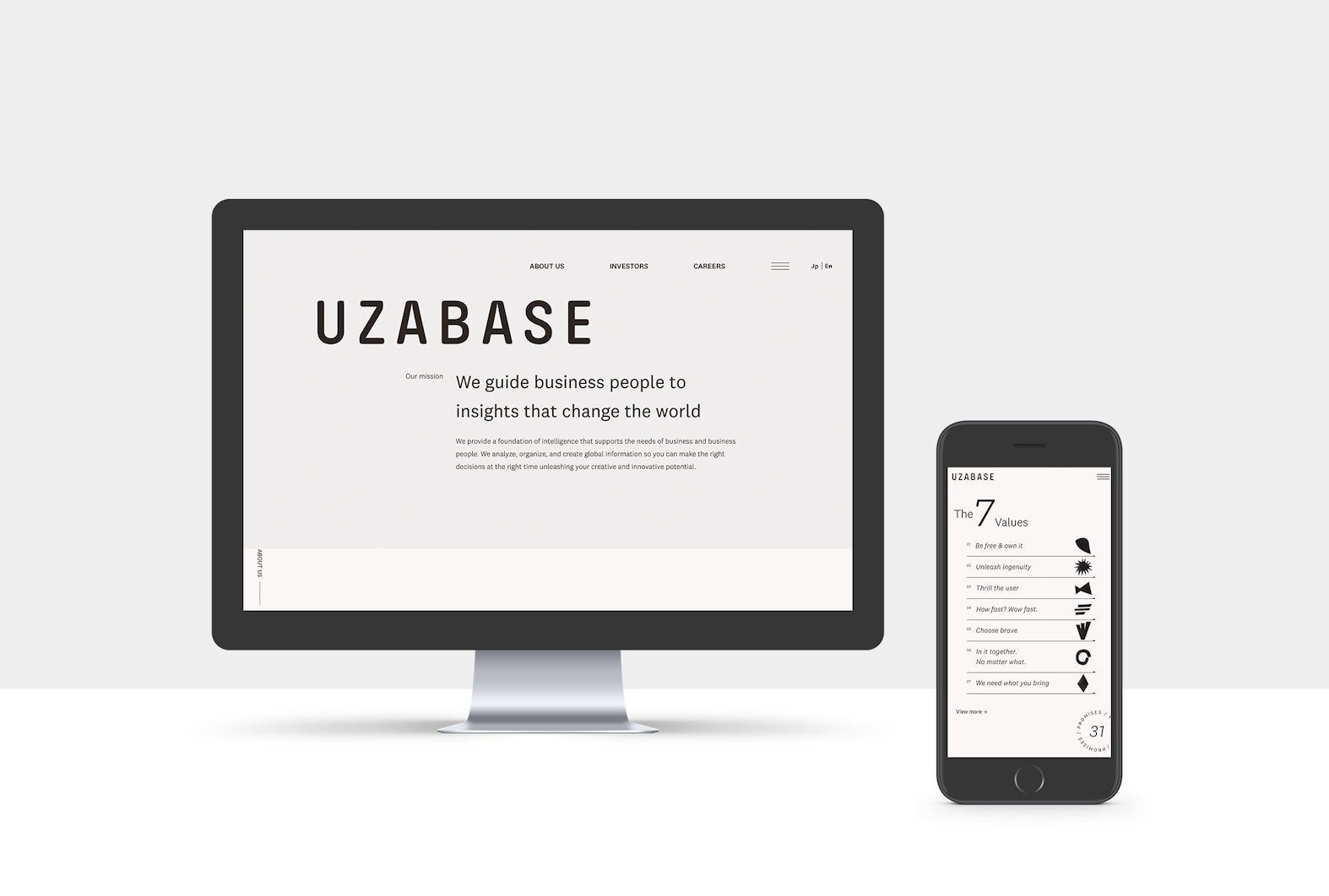 The overall design of our corporate website has been revamped to reflect the renewal of the Uzabase brand. The base colour of the new website is now monochrome, our new corporate color, which gives it a solid presence as a platform. The content and overall design have been kept simple, while animations and fonts have been designed with a flexibility in mind. In addition, we have taken a new approach with our top page, introducing our "7 Values", which are so important to the company, along with the symbols for each value, as a way of expressing our corporate culture.